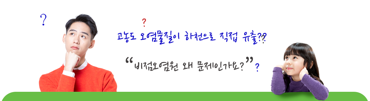 비점오염물질은 대지, 도로, 농지, 농사장, 임야 등의 장소에서 고농도 오염물질이 하천으로 직접 유출되어 하천수질 및 수생태계에 악영향을 미칩니다.